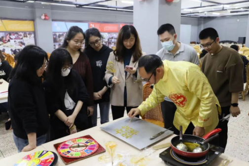 百師園內(nèi),三千件國(guó)家級(jí)、省級(jí)非遺大師精品琳瑯滿目地陳列在我們眼前,讓人嘆為觀止,目不暇接。團(tuán)干青年們跟隨王壽權(quán)老師近距離學(xué)習(xí)和體驗(yàn)糖畫這一非遺文化技藝,近距離感受工匠精神和深厚的文化底蘊(yùn)。以糖漿為墨,以長(zhǎng)勺代筆,將心意揮灑在光潔的案板上,提、頓、放、收,或一筆帶過或一氣呵成,以獨(dú)特的風(fēng)格體驗(yàn),收獲“美”與“食”的藝術(shù)享受。