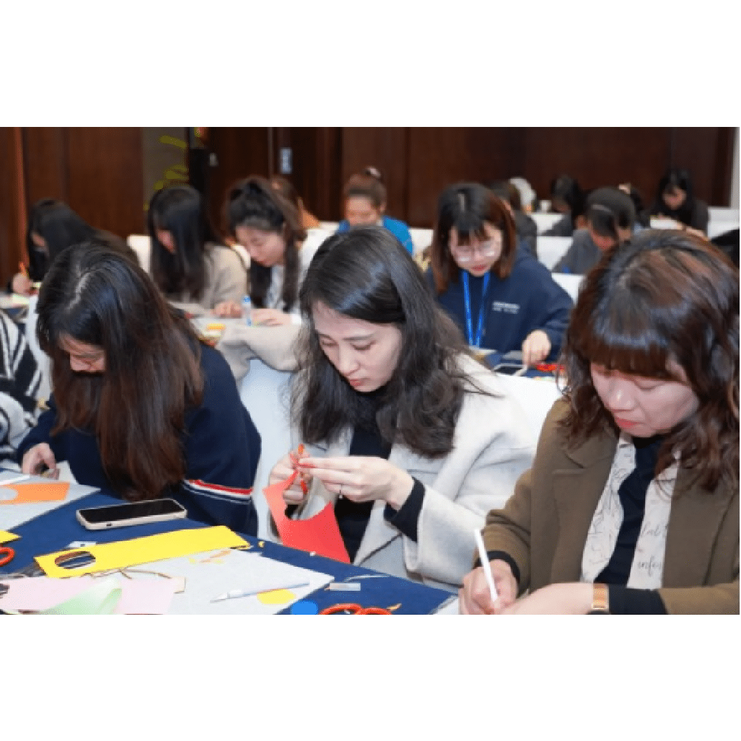 活動特邀跨媒體藝術(shù)家陳斯嘉現(xiàn)場授課,她分享汕頭國際會展中心雕塑《旭日》和剪紙畫《潮》等作品創(chuàng)作理念,帶領(lǐng)大家體驗剪刻實踐,從剪刀力度的把控到刻刀線條的雕琢,逐步示范剪紙技法?,F(xiàn)場女職工有的臨摹圖樣、有的自主創(chuàng)作,剪紙圖案各具特色,彩紙斑斕如春日花園,熾烈紅、清新綠、柔婉粉交相輝映。剪刻完成的圖案貼在木制立體花桿上,一幅幅精美的剪紙作品誕生?,F(xiàn)場歡聲笑語不斷,大家在創(chuàng)作中感受藝術(shù)魅力。