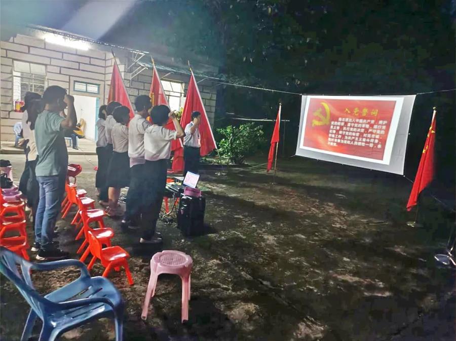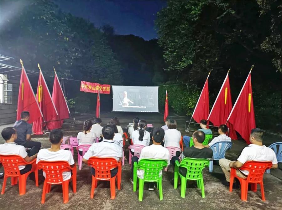 隨后,東山湖黨支部開展了“永遠跟黨走,精神永傳承”主題黨日活動。支部書記謝達堅帶領(lǐng)全體黨員在中共汕頭市委黨校舊址重溫了入黨誓詞,誓詞中每一句話鏗鏘有力、震動人心,宣示著全體黨員同志堅定的政治信仰和理想信念。為進一步豐富職工群眾精神文化生活,引導(dǎo)東山湖職工群眾深入了解紅色精神、激活紅色記憶、傳承紅色基因,東山湖黨支部黨員在烈日下工作了一個多小時,懸掛幕布、擺放桌椅,搭建起一個“移動影院”,為東山湖的職工群眾播放紅色影片《建國大業(yè)》,推動黨史學(xué)習(xí)教育深入群眾、深入基層、深入人心,獻禮建黨100周年。