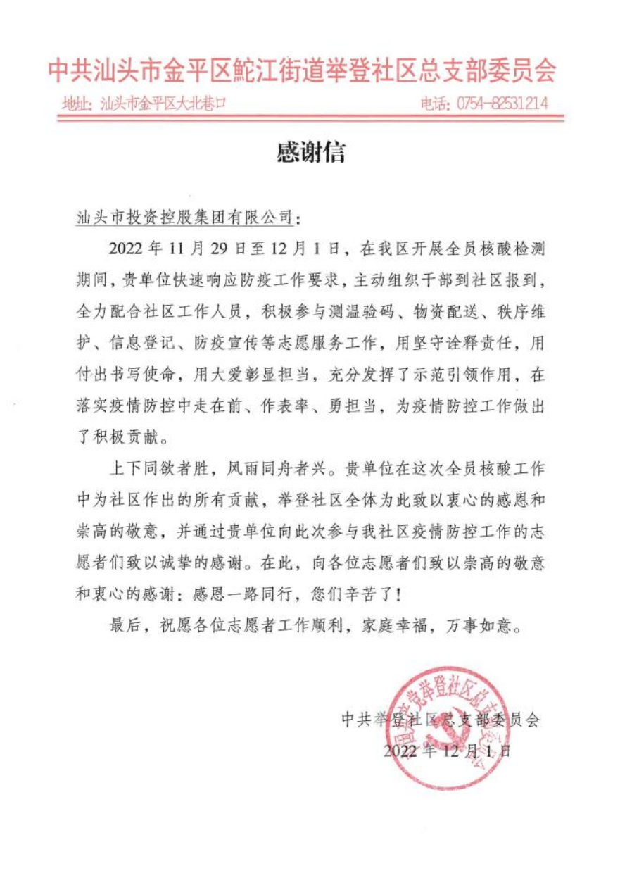 收到感謝信,大家備受鼓舞,這既是肯定,也是鞭策。接下來,市投控集團(tuán)將持續(xù)深入貫徹落實(shí)黨的二十大精神,不忘初心,進(jìn)一步統(tǒng)一思想和行動,強(qiáng)化責(zé)任與使命,繼續(xù)以實(shí)際行動彰顯國企本色與擔(dān)當(dāng)!