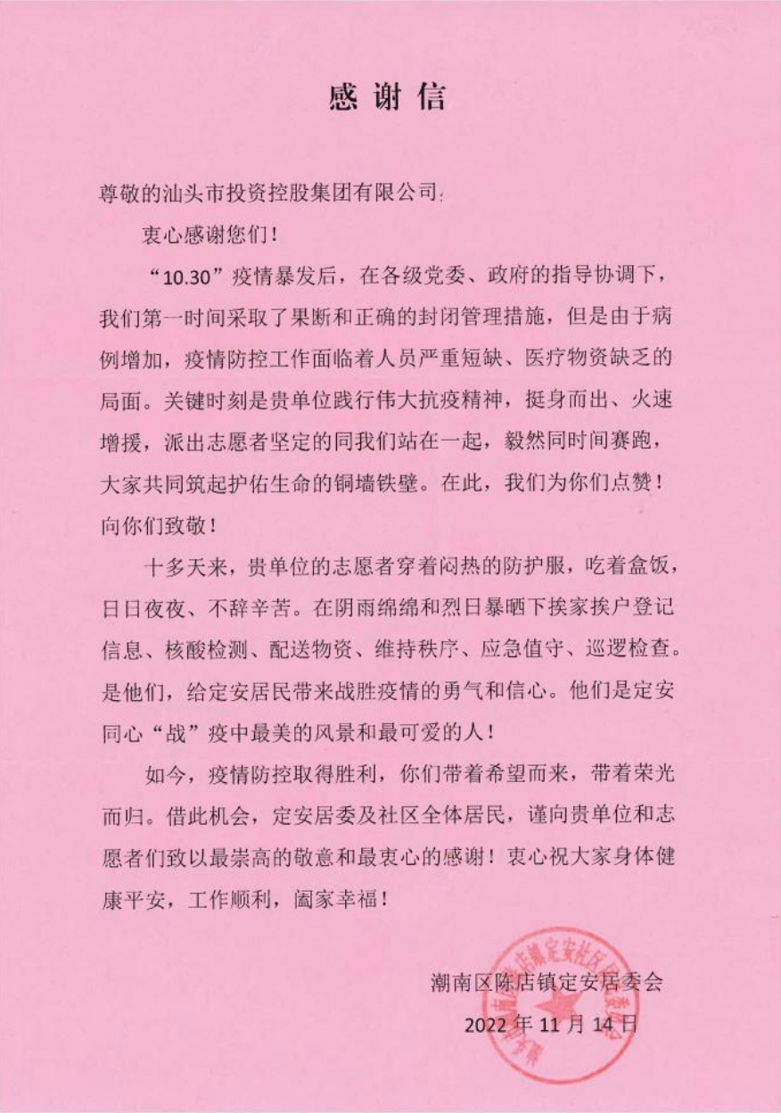 近日,市投控集團(tuán)接連收到來自安定居委、登舉社區(qū)的感謝信。一封封信件,細(xì)數(shù)著集團(tuán)公司支援人員的暖心之舉,傳遞著對支援人員沖鋒“疫”線、恪盡職守,積極參與社區(qū)疫情防控支援工作的感謝之情。